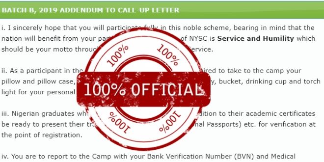 NYSC 2019 Batch B News Updates – Call-Up letter Is Out