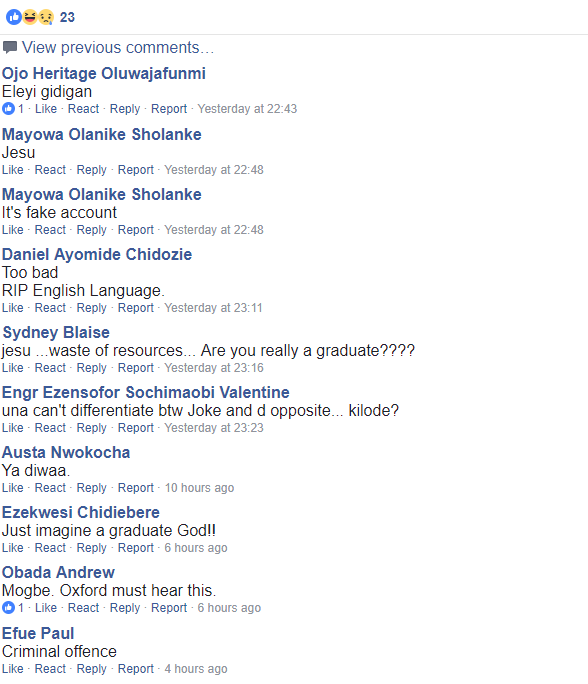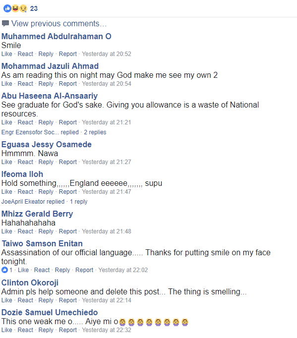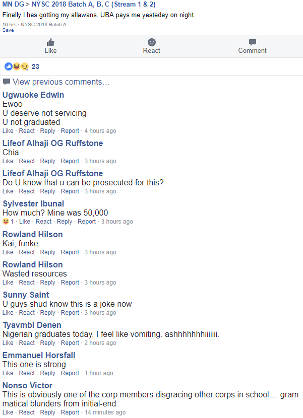 Since the post, he has got more fans that he could ever get as a normal Corper. The post attracted 54 comments as at now and only a few of them sees it just as a sense of humor in the guy. Others have been blasting and calling the poster several names.
