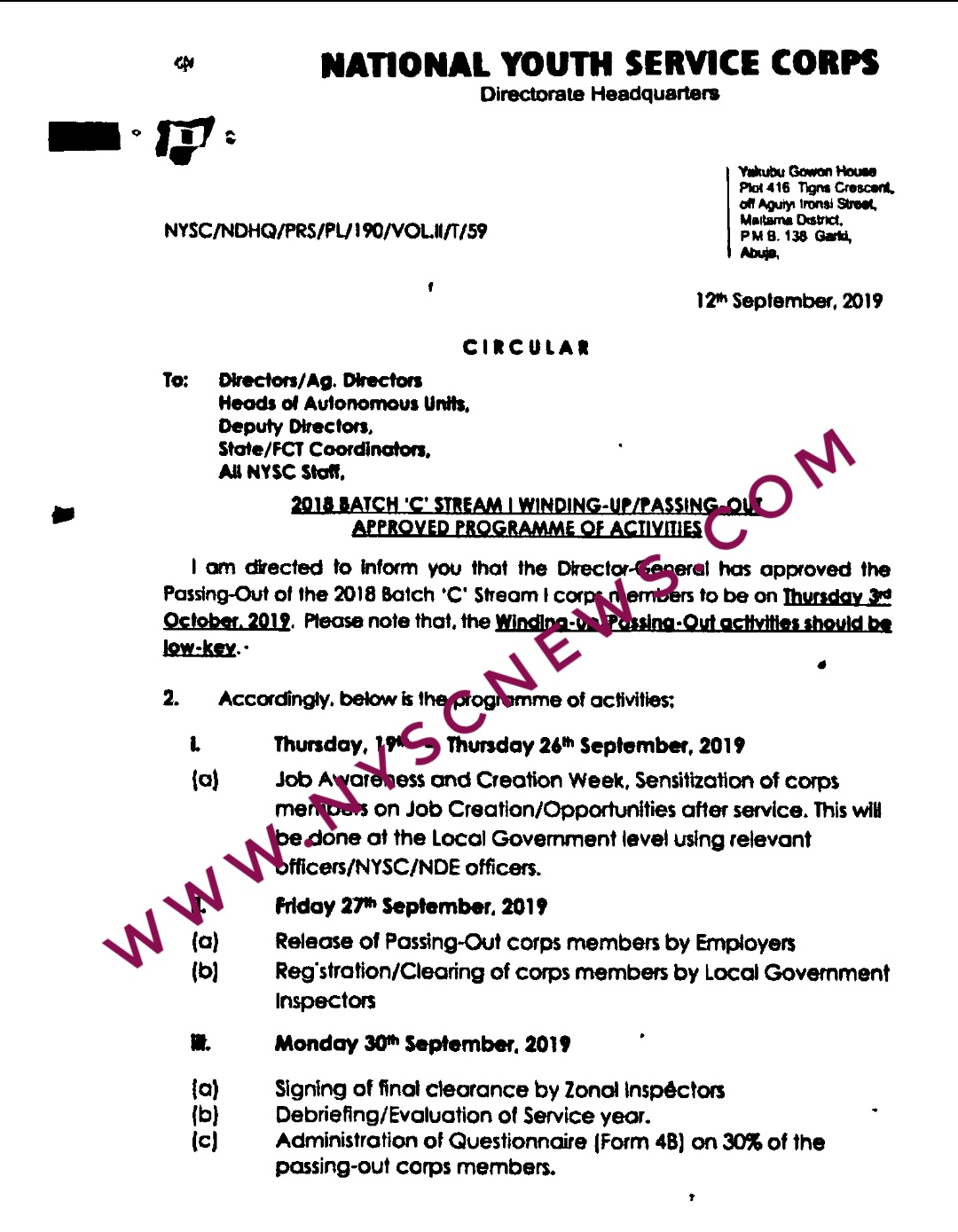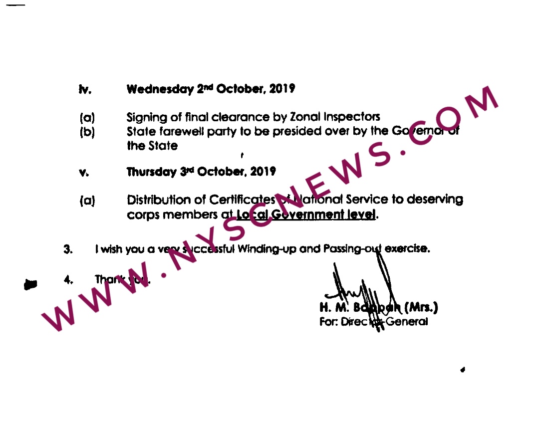 I am directed to Inform you that the Director-Geneml has approved the Passing-Out of the 2018 Batch ‘C’ Stream l corps members to be on Thursday 3rd October 3rd 2019.