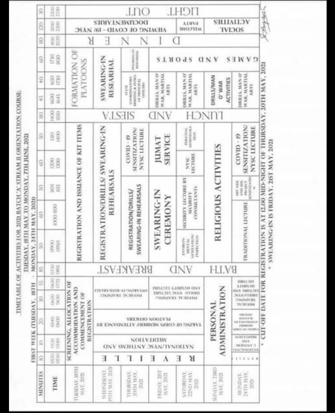 This timetable above is a very hilarious timetable and it’s not from the NYSC management. The timetable is not real at all, the details in it were generated by whoever wrote it. Kindly disregard the timetable. Its not official and its ridiculous. Stay connected