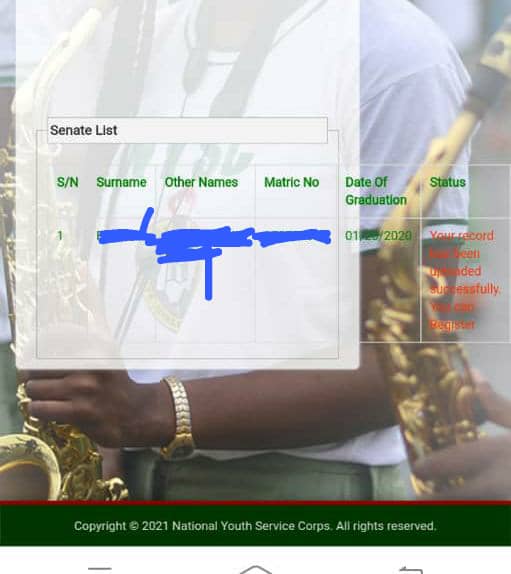 This screenshot is from a PCM who has successfully verified his name on the NYSC Portal. Please, kindly click the button below to go to the NYSC portal for the senate list to verify your name. Please if you are still seeing no record found, there should be no course for alarm. The upload is in progress and everybody will not see it at once.