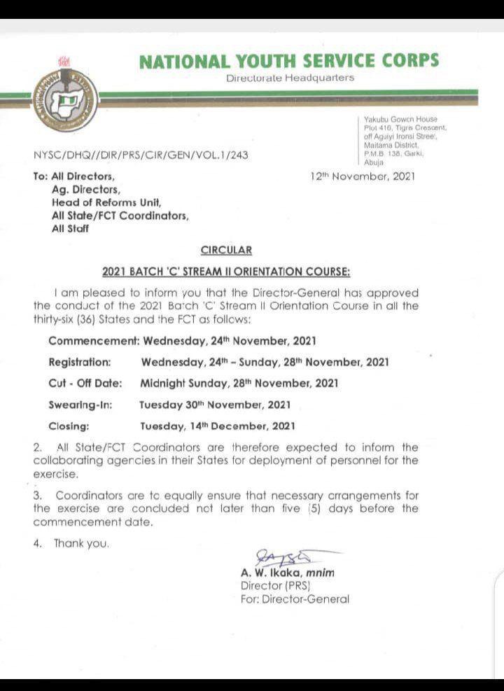 The NYSC 2021 Batch C Orientation Camp date circular is out and you need to know about it. Let me show you the circular so that you can see the date and I will then tell you what you should know.