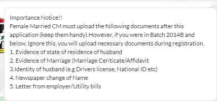 Female Married CM must upload the following documents after this application (keep them handy). However, if you were in Batch 2014B and below, Ignore this, you will upload necessary documents during registration.