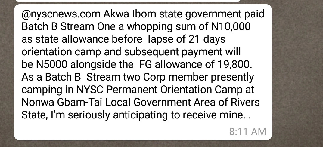 “@nyscnews.com Akwa Ibom state government paid Batch B Stream One a whopping sum of N10,000 as state allowance before lapses of 21 days orientation camp and subsequent payment will be N5000 alongside the FG allowance of 19,800. As a Batch B Stream two Corp member presently camping in NYSC Permanent Orientation Camp at Nonwa Gbam-Tai Local Government Area of Rivers State, I’m seriously anticipating to receive mine…”