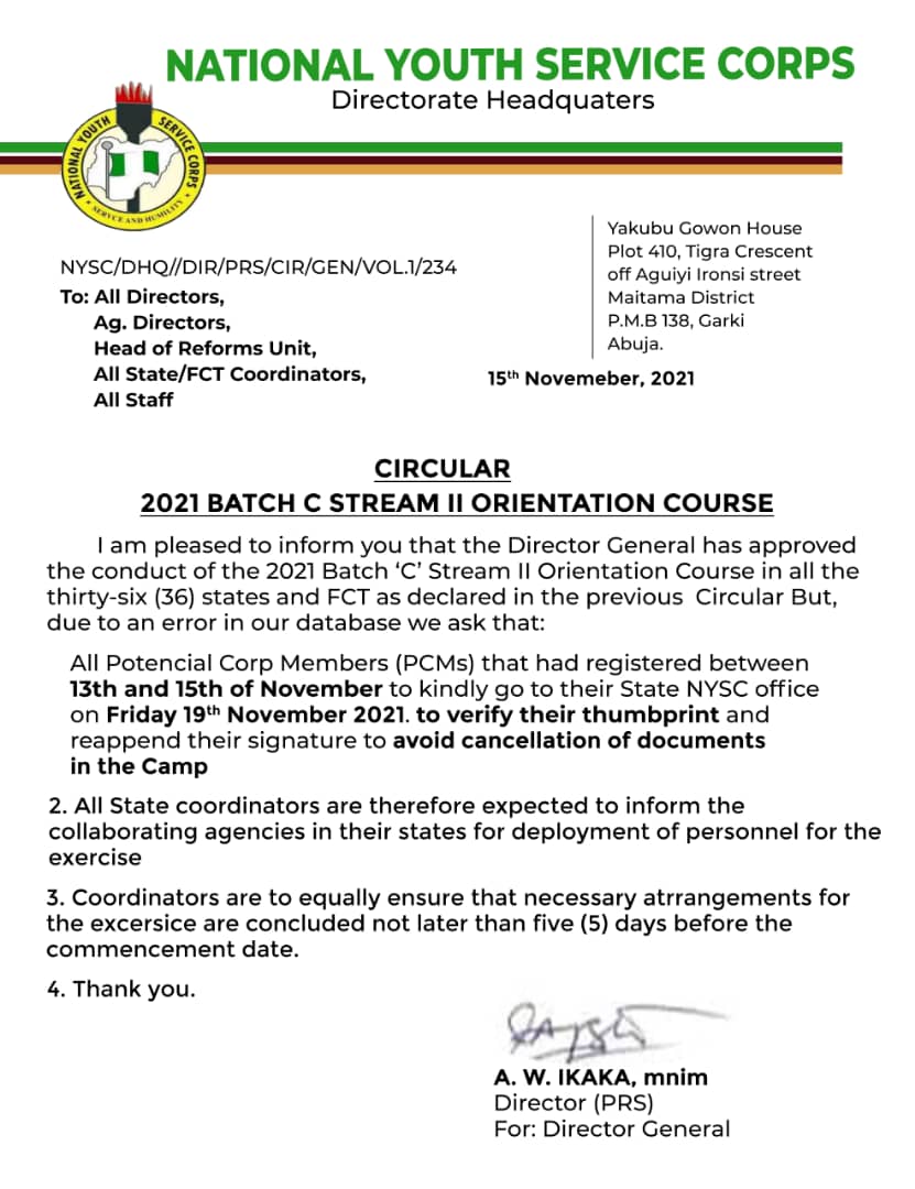 The circular claimed there is an error in NYSC Database and everyone who registered around 13th – 15th November should go to the State secretariat.